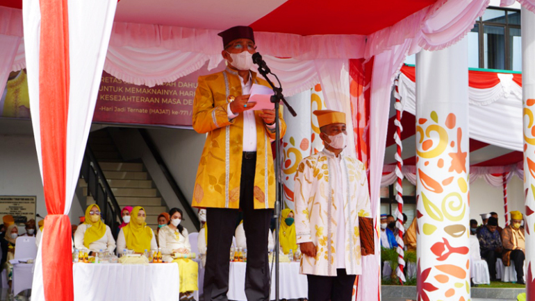 TERNATE – Wali Kota Ternate M Tauhid Soleman, jadi Irup Upacara Hari Jadi Ternate (HAJAT) Ke-771 tahun yang berlangsung di halaman Kantor Walikota Ternate, Jalan Pahlawan Revolusi, Rabu (29/12/2021).
