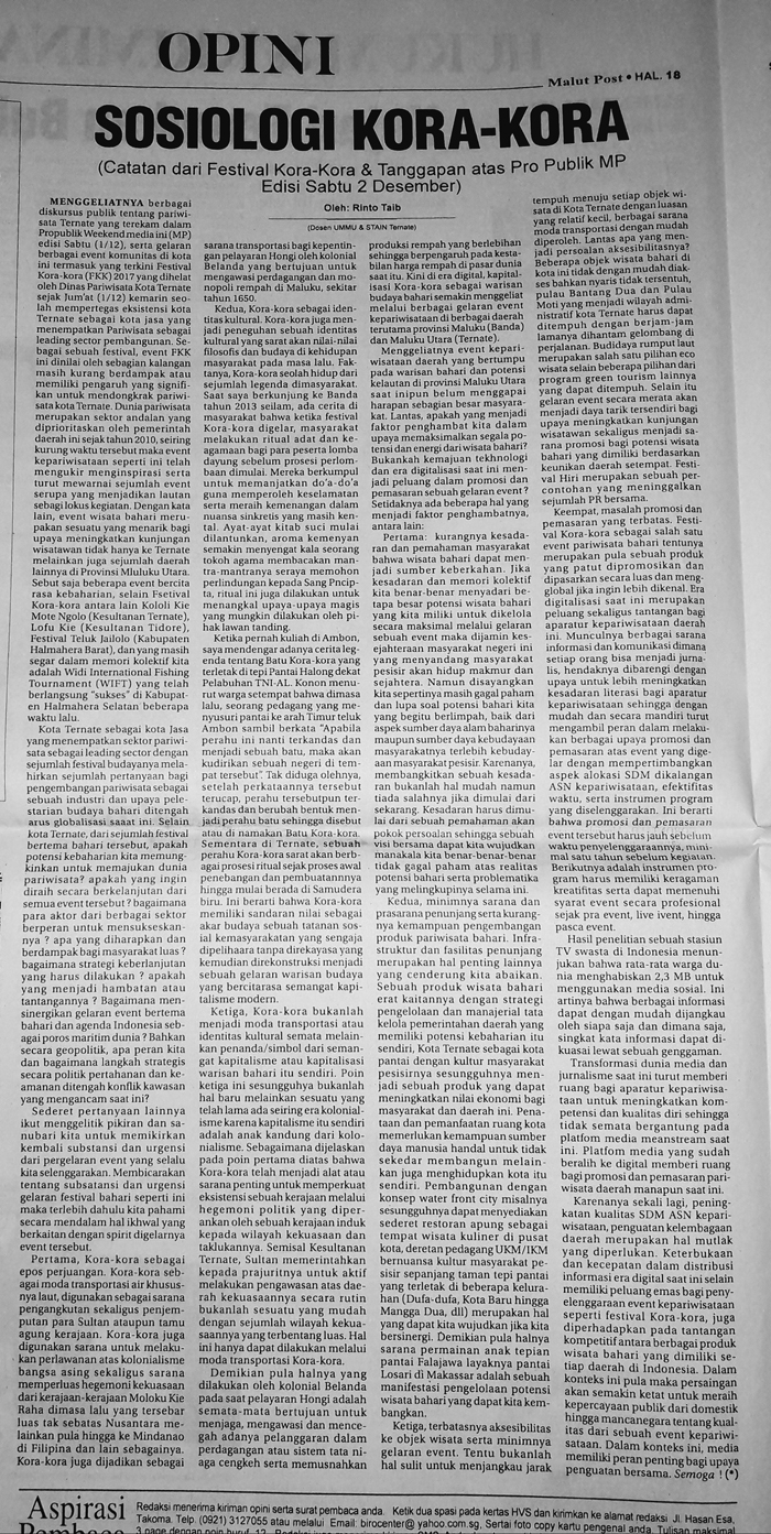 Ide tulisan ini berawal ketika membaca sebuah postingan di Instagram yang memberikan informasi terkait penyelenggaraan Sociology Festival 2018 bertajuk “Sosiologi Untuk Kita” yang akan diselenggarakan pada (25-27/5) nanti di Fort Oranje Ternate dengan beberapa rangkaian kegiatannya antara lain: Bacarita Politik Kebudayaan, Talk Show, Book Discussion, Public Lecture, serta berbagai kemasan acara hiburan lainnya (pentas musik, teater & baca puisi). Secara pribadi, pengalaman belajar Sosiologi di Ambon tak jauh berbeda dengan teman-teman yang menggeluti studi dan kajian keilmuan lainnya.