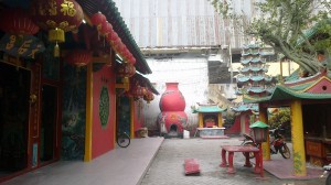 Setiap beberapa menit terdengar bunyi tambur ditabuh untuk memberi tanda kepada “penghuni surga” bahwa umat-Nya telah datang untuk berdoa. Harum dupa hio melambung ke langit. Sementara umat yang datang untuk bersembahyang mengangkat hio-nya untuk berdoa kepada para dewa. Mayoritas peziarah tidak hanya berdoa kepada satu dewa. Yang menarik, tidak ada pemisahan antara dua kepercayaan itu, dimana semua dewa berada dalam satu ruangan yang hanya dipisahkan sekat yang nyaris tanpa batasan berarti.