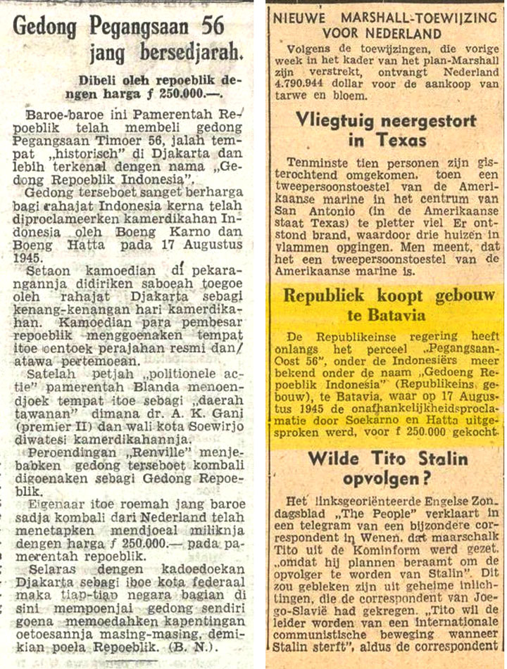 Sebuah berita di koran Sin Po 5 Juli 1948 mengabarkan “Eigenaar (pemilik rumah) itoe roemah jang baroe sadja kombali dari Nederland telah menetapken mendjoeal miliknja dengen harga ƒ 250.000,- pada pemerentah repoeblik.” Artikel serupa juga dimuat koran Provinciale Overijsselsche en Zwolsche pada 12 Juli 1948 dengan menyebutnya sebagai Gedoeng Repoeblik Indonesia. Catatan Harry Poeze, dalam Recent Dutch Language Publications, menyatakan bahwa orang Belanda itu adalah Jhr. Pieter Rutger Feith seorang advokat dan pejabat Departemen Hukum dan Sejarah Batavia, yang terkonfirmasi dalam berita di Koran Pemandangan 11 Januari 1941. (Catatan: di beberapa situs web, dan buku sejarah disebutkan bahwa rumah tersebut merupakan hadiah dari seorang pengusaha keturunan Yaman, namun tidak ada bukti yang mendukung pernyataan tersebut).